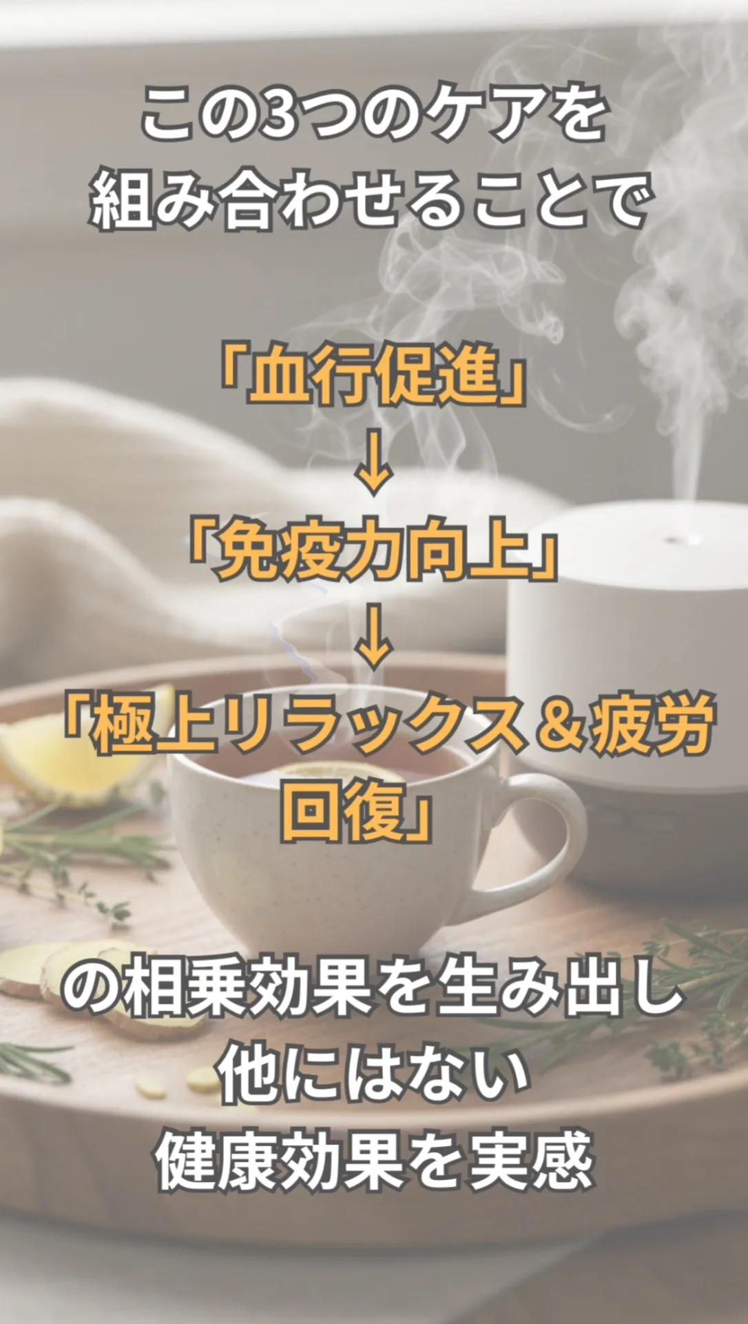 この3つのケアを組み合わせることで、「血行促進」→「免疫力向上」→「極上リラックス&疲労回復」の相乗効果を生み出し、他にはないパワフルな健康効果を実感いただけます。