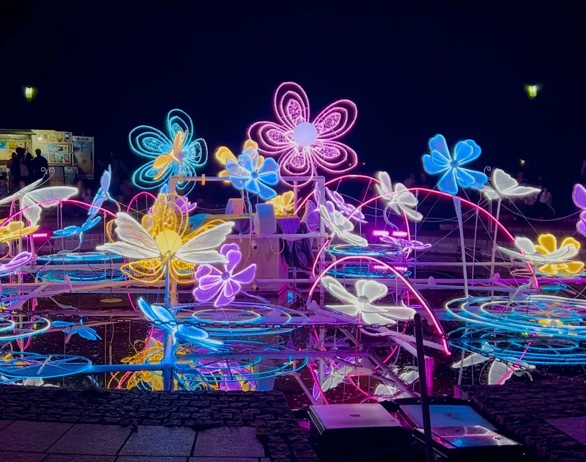 日中の開放的な雰囲気とは打って変わって、夜の公園は光に包まれた別世界。特に水辺に反射する光や、カラフルで鮮やかに照らされた木々は幻想的でとても綺麗でした。